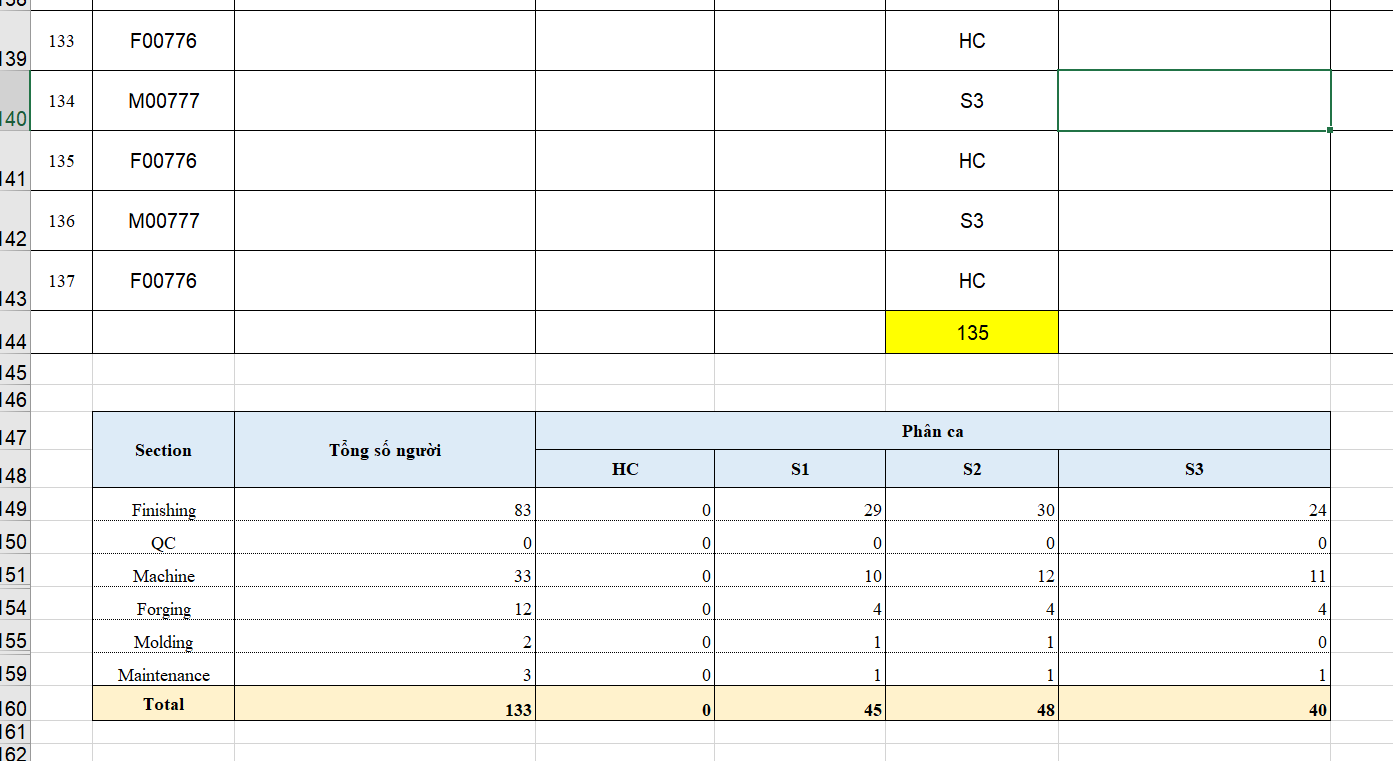 EM chào các thầy cô. em có 2 bảng như ảnh. bảng trên là bảng chi tiết danh sách nhân viên đi làm thêm theo ca (hành chính, ca 1, ca 2 hoặc ca 3.) bảng dưới là bảng tổng hợp mỗi bộ phận có bao nhiêu nhân viên đi làm, mỗi ca có bao nhiêu người. ở bảng trên, ô bôi vàng là ô đếm tổng bn nhân viên đi làm, em đang để hàm counta nhưng vì em vừa chèn thêm 2 hàng vào trên hàng tổng nên kết quả đang không đúng.