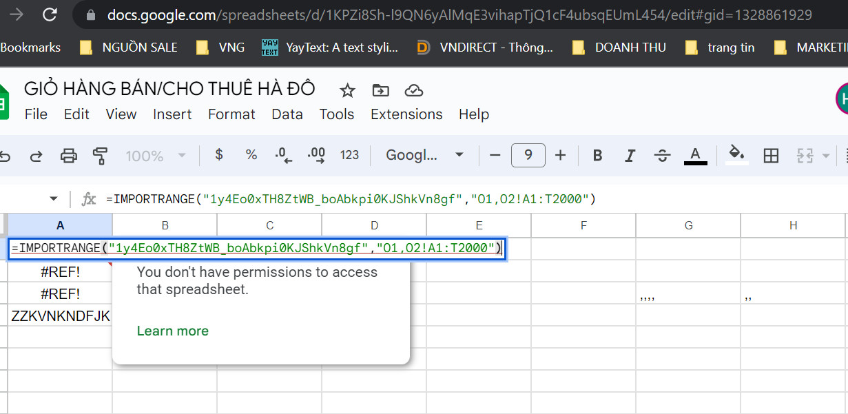 Chào bạn, Để có thể dùng hàm Importrange này bạn phải cấp quyền file cần lấy dữ liệu (là đường dẫn trong ảnh) thì hàm mới chạy được nhé.
