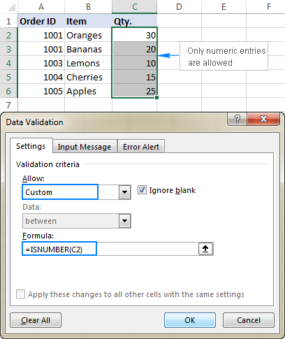 Nhưng bạn có thể dễ dàng thực hiện với một công thức xác thực dữ liệu tùy chỉnh dựa trên hàm ISNUMBER, như sau: