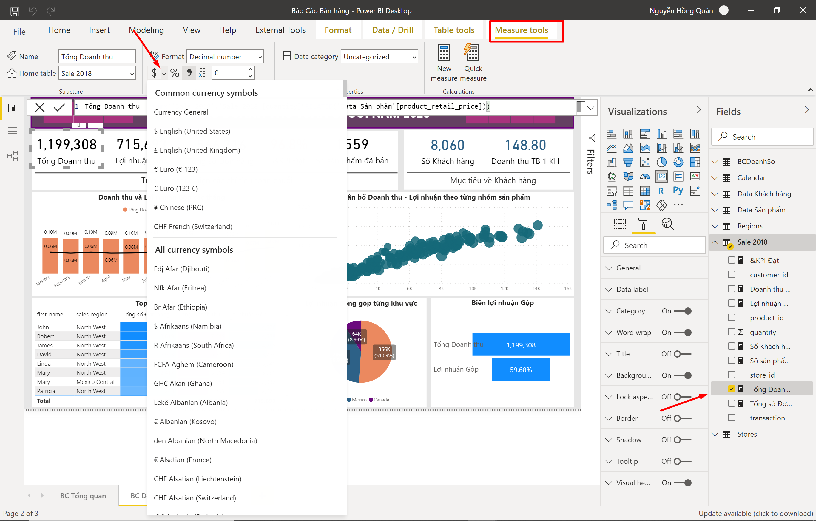 - Chọn Measure lên card (như hình là Tổng Doanh thu) -> Measure tools -> Format, có biểu tưởng $ bạn trỏ xuống sẽ có các đơn vị tiền tệ khác nhé