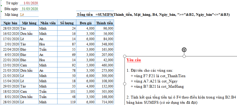B cho mình hỏi là vì sao thay vì mình đặt tên vùng dữ liệu giống bài này thì mình đặt tên cột giống chương 1 thì lúc sử dụng hàm SUMIFS nó lại ra kết quả là ô trống vậy b?