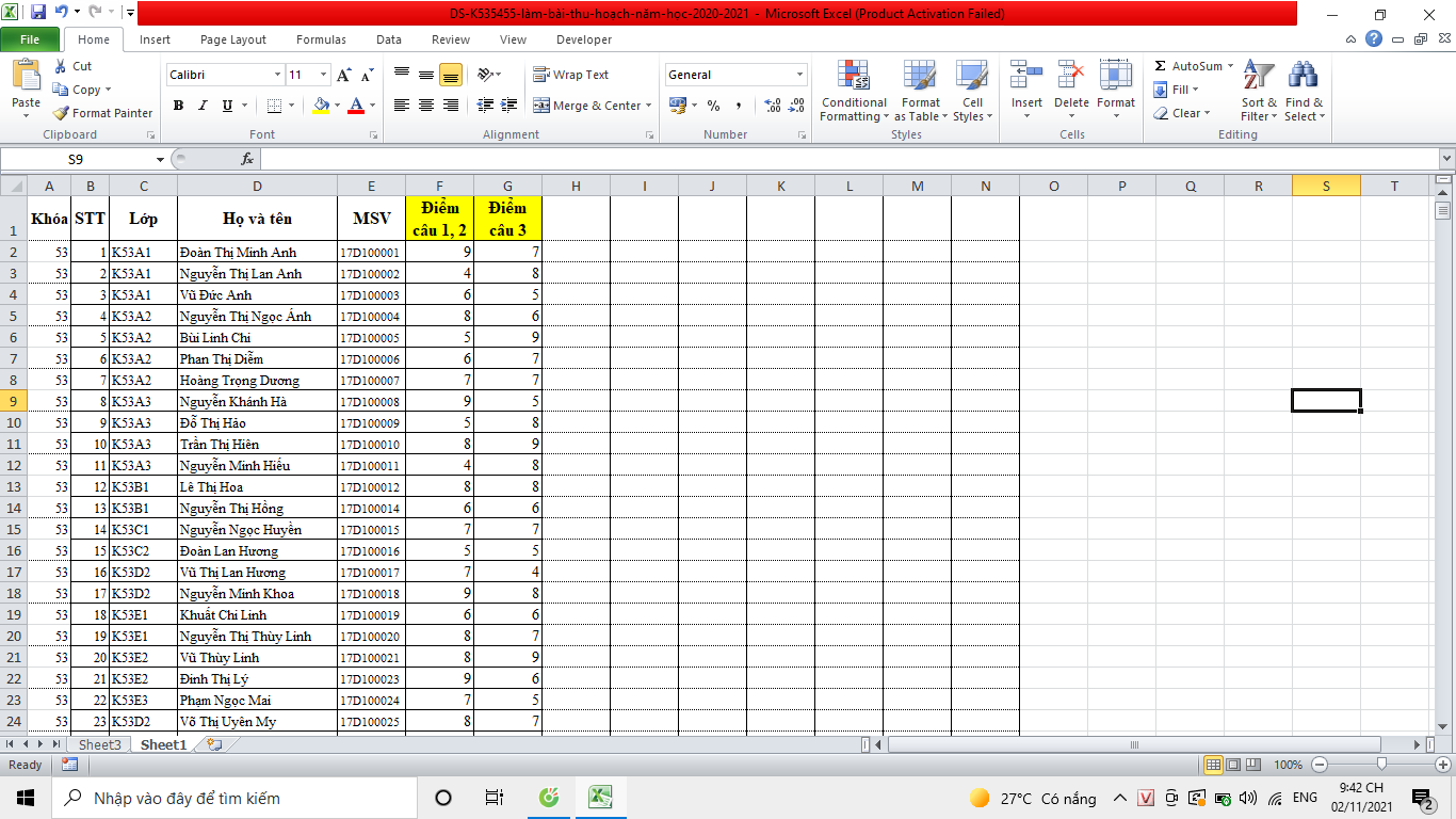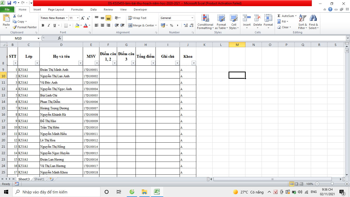Em muốn điền dữ liệu vào ô trống ở sheet 3 với dữ liệu đã có ở sheet 1 thì sử dụng hàm, công thức nào ạ (với điều kiện họ tên, lớp, khoa có thể trùng ạ)