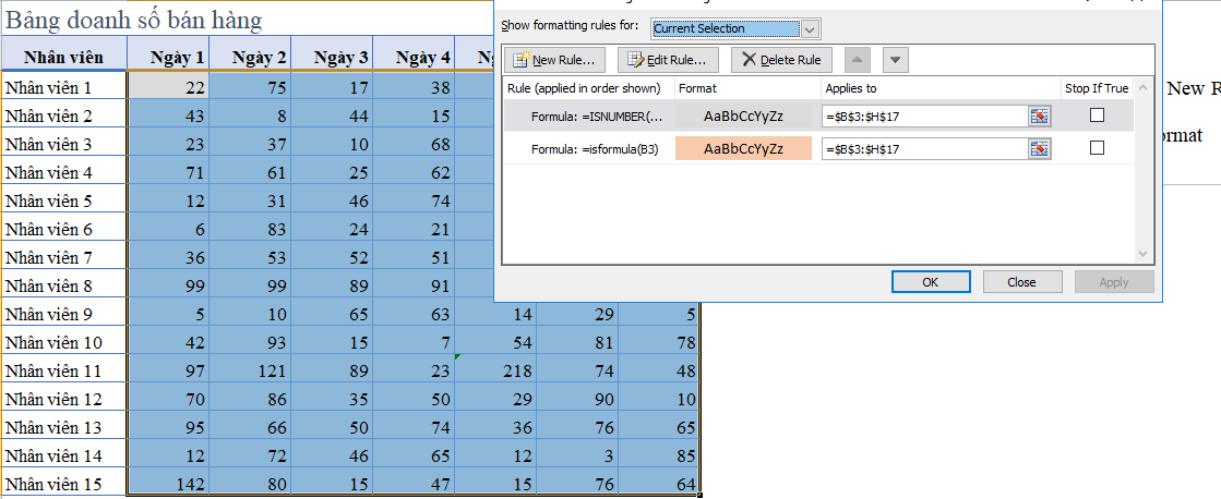 Bạn chú ý là ở đây bạn dùng 2 rule: 1 cái là ISNUMBER, 1 cái là ISFORMULA.