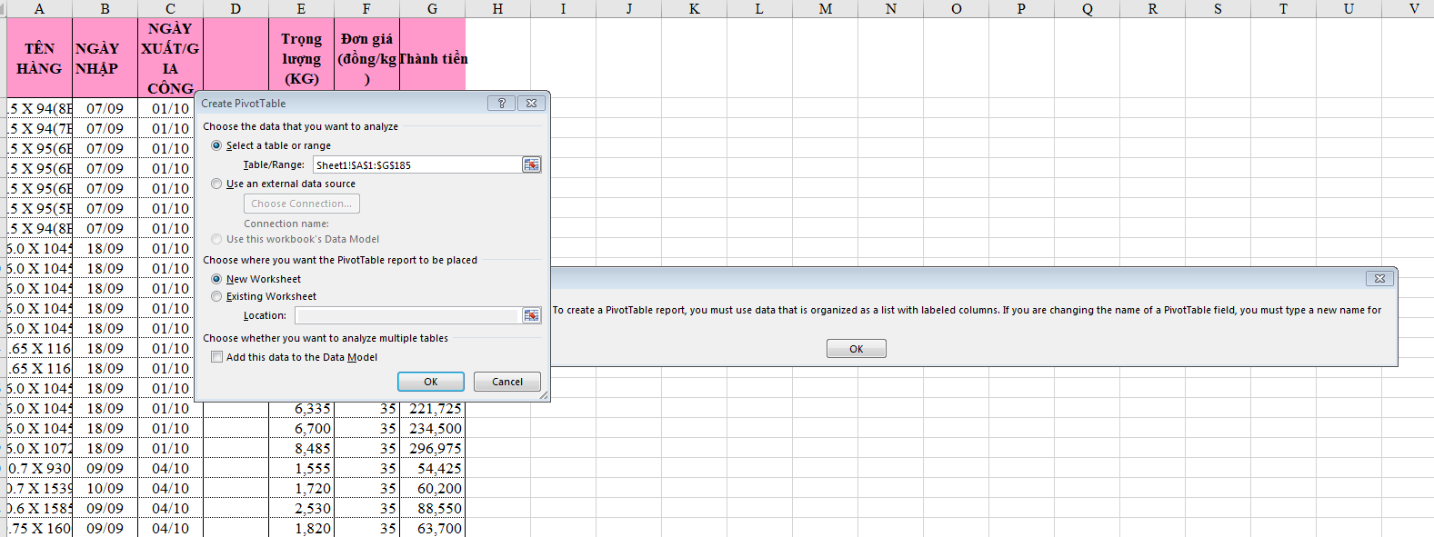 Khi muốn tạo pivot table thì dòng tiêu đề trong bảng phải có đủ trên các cột. Ở đây có 1 cột đang không có tên tiêu đề => bạn kiểm tra lại nhé.