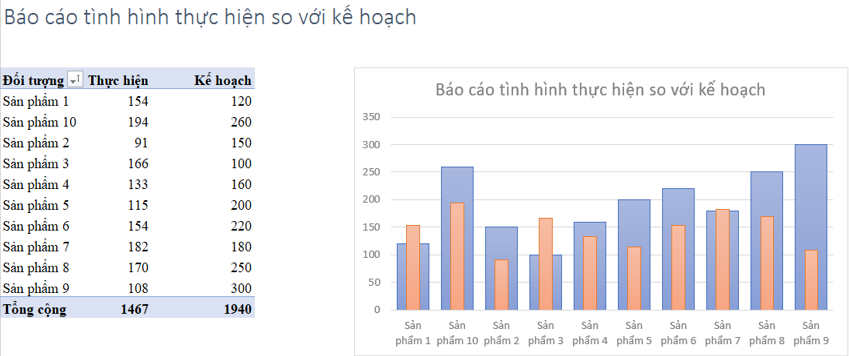 Bạn sắp xếp dựa theo cột chứa dữ liệu số, ví dụ như cột Thực hiện hoặc cột Kế hoạch nhé. Khi đó biểu đồ sẽ tự sắp xếp lại. Thao tác sắp xếp là bấm chuột phải tại cột cần sắp xếp, chọn mục Sort > chọn thứ tự sắp xếp theo ý muốn.