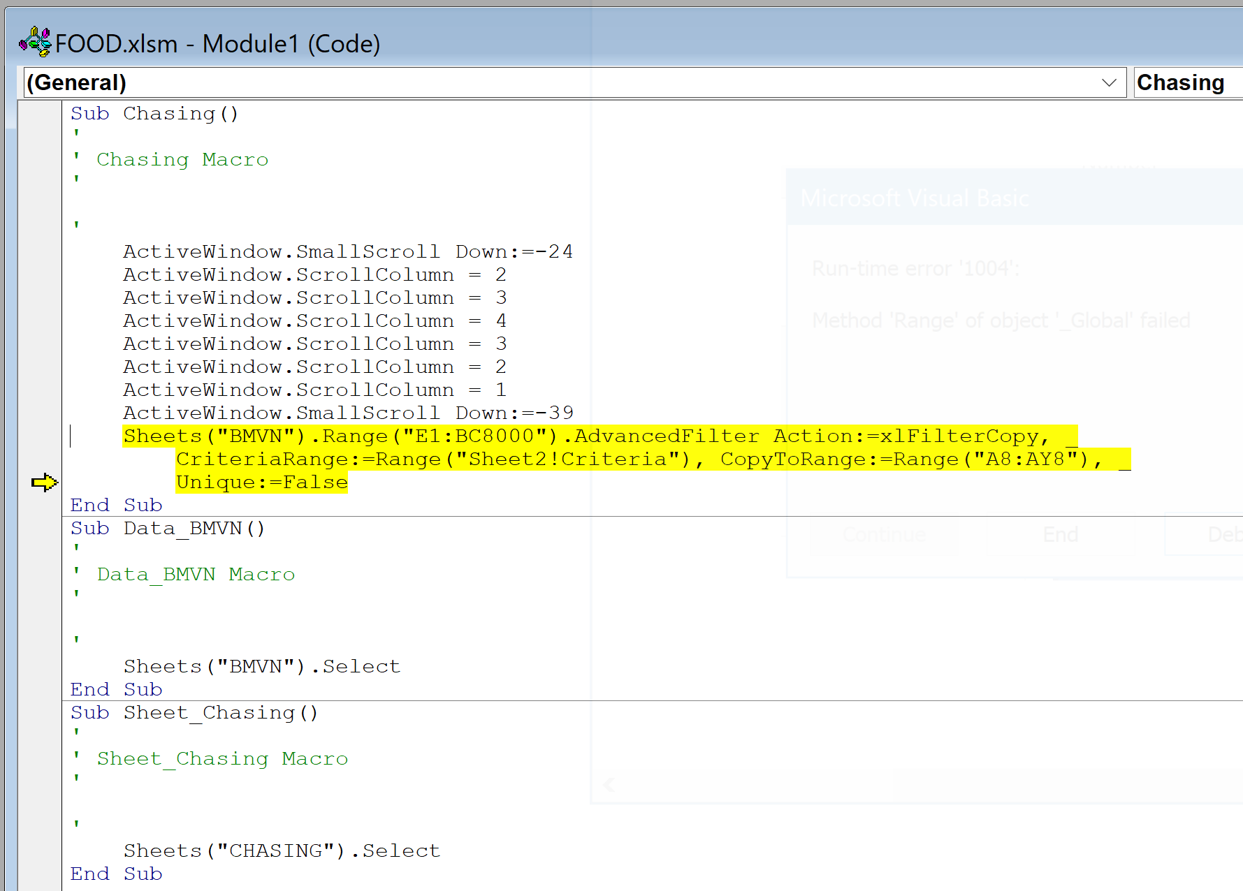 Khi bạn chạy macro mà không phải ở Sheet có chứa các vùng điều kiện, vùng kết quả trích lọc thì sẽ có lỗi.