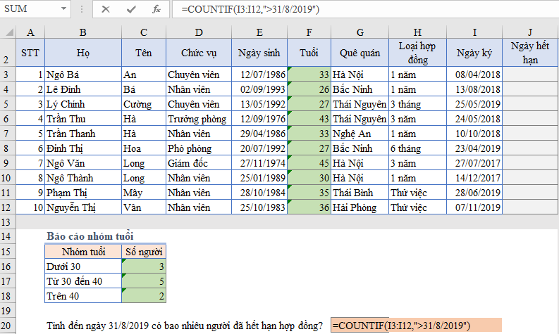 =COUNTIF(I3:i12,">="&DATE(2019,8,31)) > COUNTIF(I3:i12,">=43708") bản chất ngày tháng cũng là một ngày nên phải thêm dấu & để so sánh