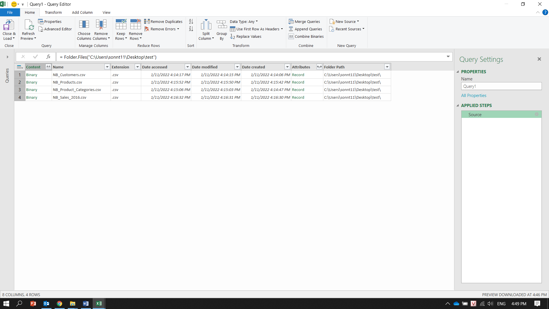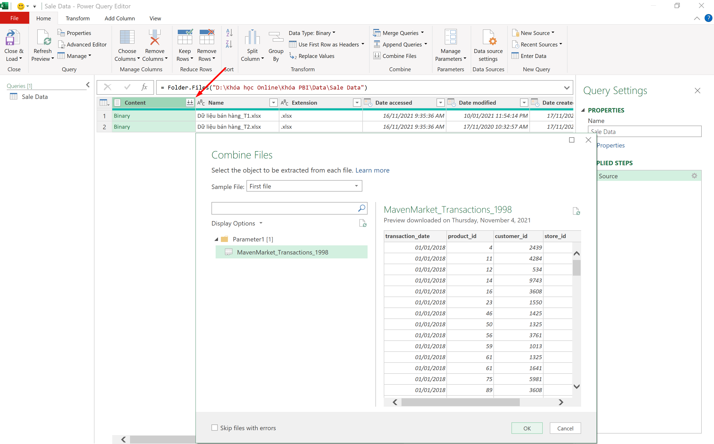 - Bạn click vào mũi tên như trong hình ở cột Content -> Chọn file mẫu xuất hiện và OK để ghép các file. Ở đây bạn có thể thấy khi load folder, bảng đang là thông tin của các file thôi (tên, định dạng, ngày tạo ...), để ghép nội dung ta cần export ở cột Content như hướng dẫn dưới của gv nha: