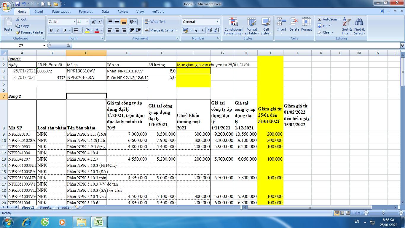 không đúng rồi chuyên gia ơi! Mình muốn tham chiếu ở bảng 1 chỗ phần bôi vàng mức giảm giá từ 25/01 đến 31/01 với dữ liệu lấy từ bảng 2 là cột 9 tham chiếu theo mã sản phẩm với điều kiện ngày của bảng 1 cơ! Nếu ngày ở bảng 1 trong khoảng từ 25/01 đến 31/01 lẫy mã hàng trên thì sẽ được tham chiếu ở cột 9 của bảng 2 ạ!. Chỗ phẩn mình bôi vang ở bảng 2 ý chuyên gia!