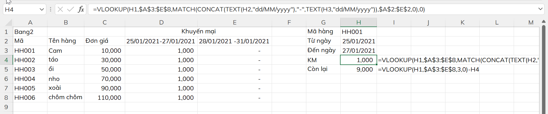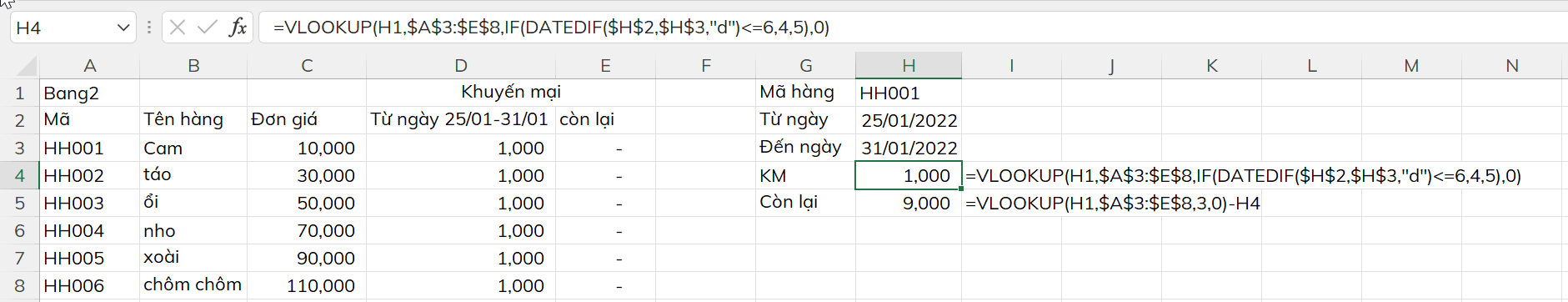 Ko vân đề là theo điều kiện ở bảng 1 là ngày từ 25/1 đến 31/1 thì mới đc giam gia tại cột 9 của bảg 2 ạ. Như vậy là phải lồng hàm if với vlookup . Chuyen gia xem giúp em