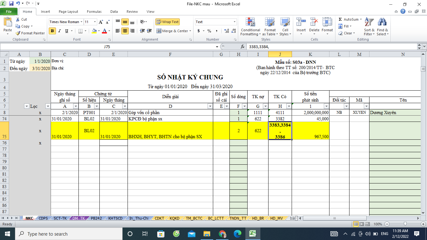 em hạch toán BHXH BHYT BHTN vô 1 dòng như vậy được k ạ