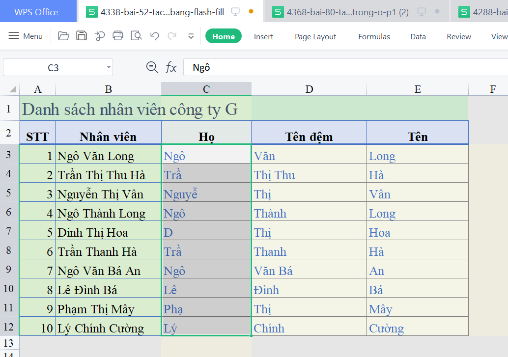 công thức gì ạ??? em làm theo hướng dẫn, ghi tên Họ người đầu tiên ra rồi bôi đen cả cột vào thẻ Home-> Fill-> flash fill thôi