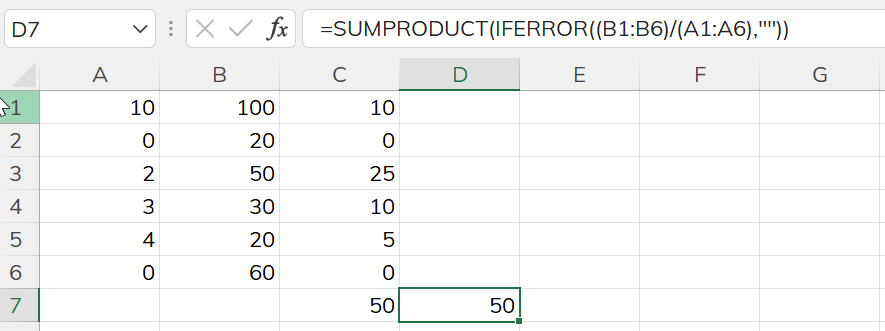 =SUMPRODUCT(IFERROR((B1:B6)/(A1:A6),"")) bạn làm như sau nhé
