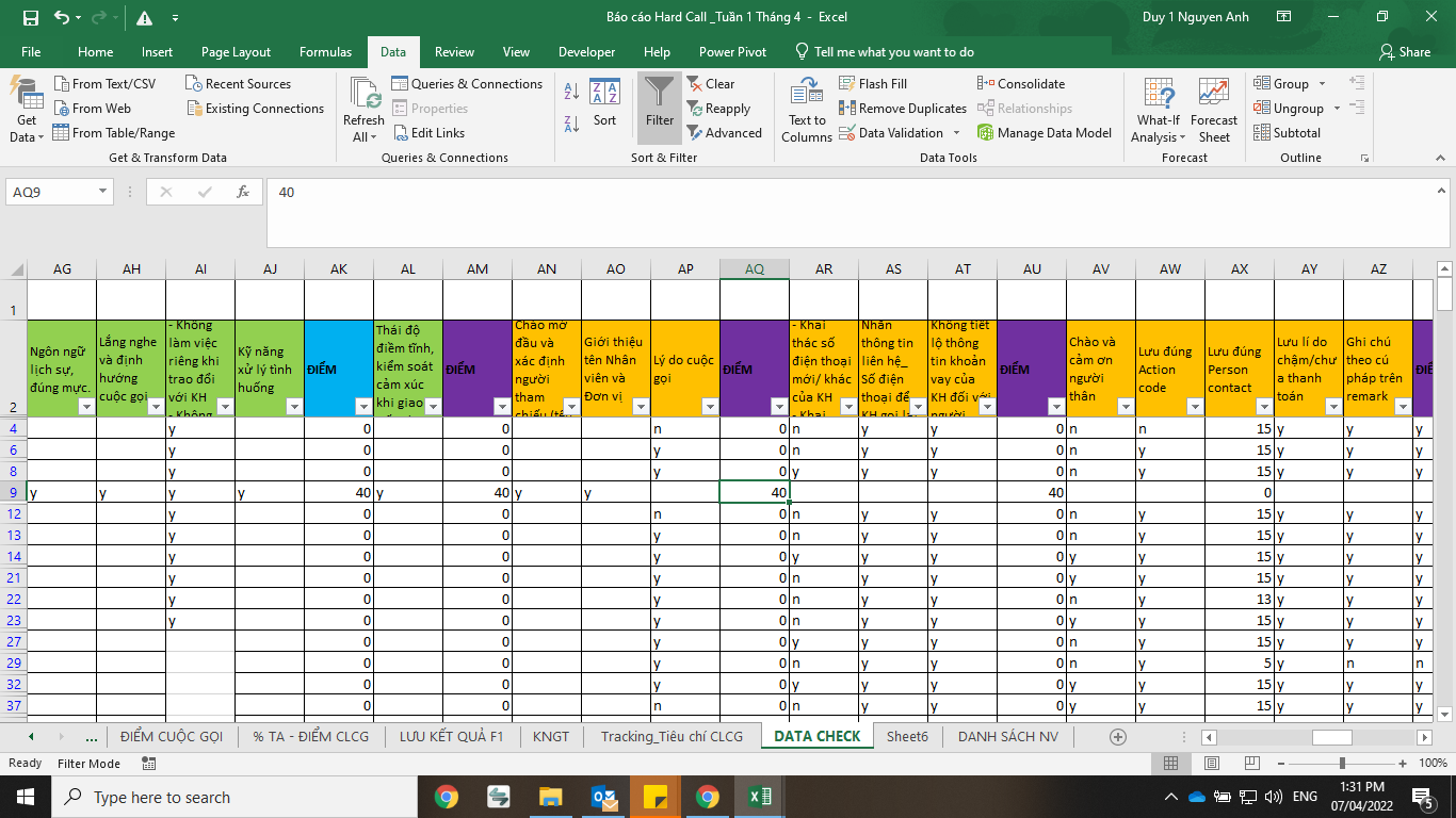 Mình muốn đếm dữ liệu trong những cột này nhưng có 1 số cột ko cần đếm nó nằm liền kề nhau với cột cần đếm , dùng hàm count như thế nào để nó trừ ra không đếm các cột không cần ạ , cột cần đếm gồm cột AN đến AP và thêm cột AV , mình có dùng thử hàm như này nhưng số tính ra không đúng