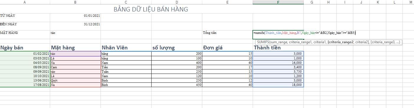 Sumifs(..., Ngày_bán, "<="&$B$2, Ngày_bán, ">="&$B$3)