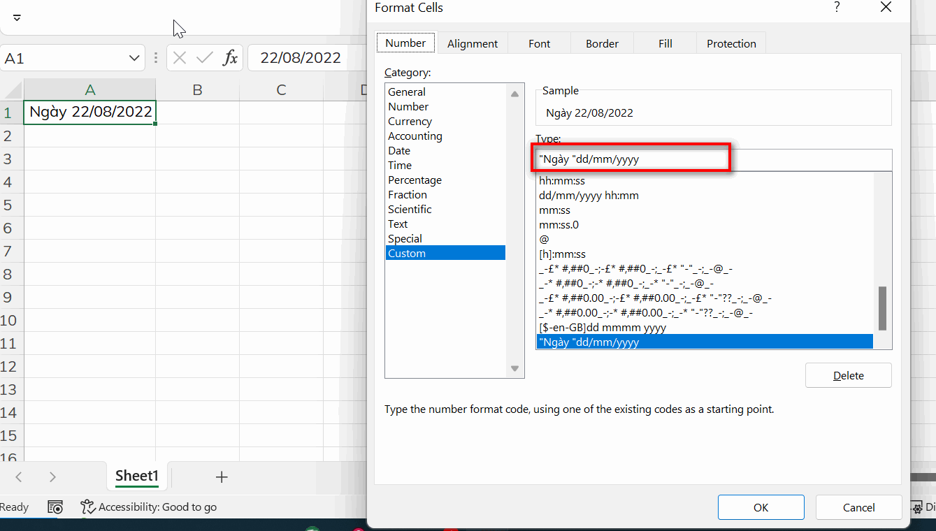 Bạn gõ số 22/08/2022 rồi custom như sau