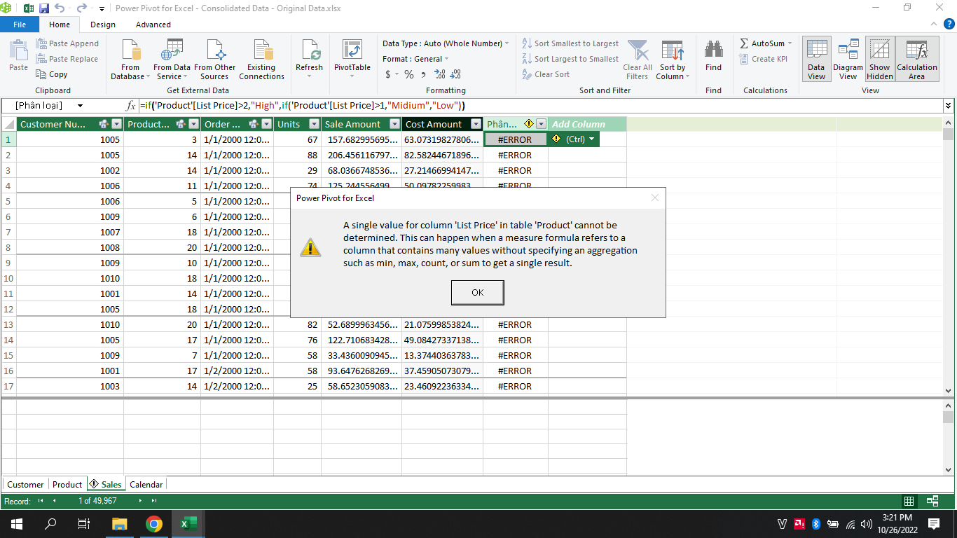 Mình sử dụng hàm IF nhưng bị lỗi như trong hình. Mình đã xoá hết toàn bộ Measure formula rồi nhưng vẫn bị lỗi này ạ. Ngoài ra, khi mình gõ “List Price” để chọn cột nhưng Powerpivot không đề xuất ra như trong clip.