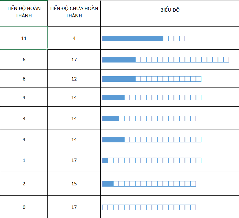 Anh chị cho e hỏi với ạ, cái cột tiến độ hoàn thành hết 1 ngày là mình phải tăng nên 1 đơn vị, anh chị có hàm nào mà tính được cột đó cộng hết thêm 1 đơn vị không ạ