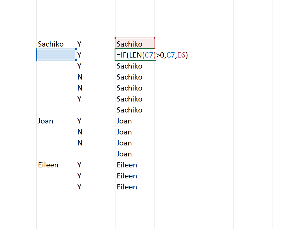 Phần này xử lý ở ngoài bằng Excel sẽ dễ hơn đó bạn, vì trong Power Query thì chỉ xử lý được cả trường. Mình hay dùng công thức IF như này để điền các phần trống với dữ liệu là dữ liệu ở đầu