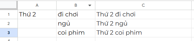 ô A1: thứ 2. Ô B1: đi chơi, B2: ngủ, B3: coi phim. Mình muốn nối A1 lần lượt với B1,2,3 ko trùng lặp thì làm sao