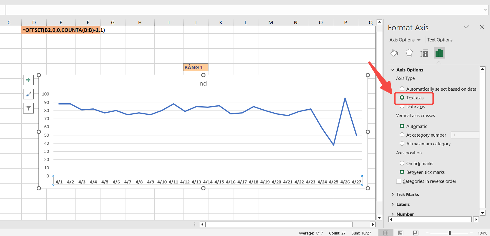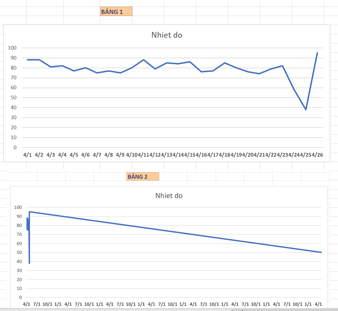 Em đã làm theo hướng dẫn đặt 2 Nam range là Date (vùng A2:A27) và Temp (vùng B2:B27) bằng hàm Offset+Counta và vẽ được đồ thị như bài giảng (bảng 1).