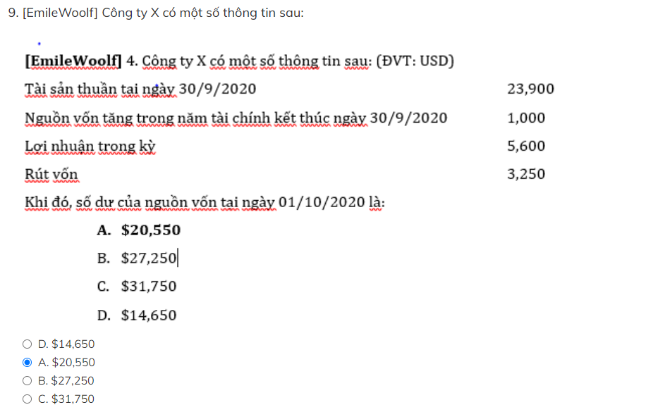 Hi e, câu này đề bài bị typing nhầm, ý hỏi nguồn vốn tại ngày đầu kỳ, 1.10.19 đó, thì mình tính ngược trở lại là ra thôi, với TS thuần (Nguồn vốn) tại cuối kỳ = Đầu kỳ + Góp vốn mới + LN làm ra - Rút vốn; Từ đây suy ngược ra lại đầu kỳ thôi e ạ.