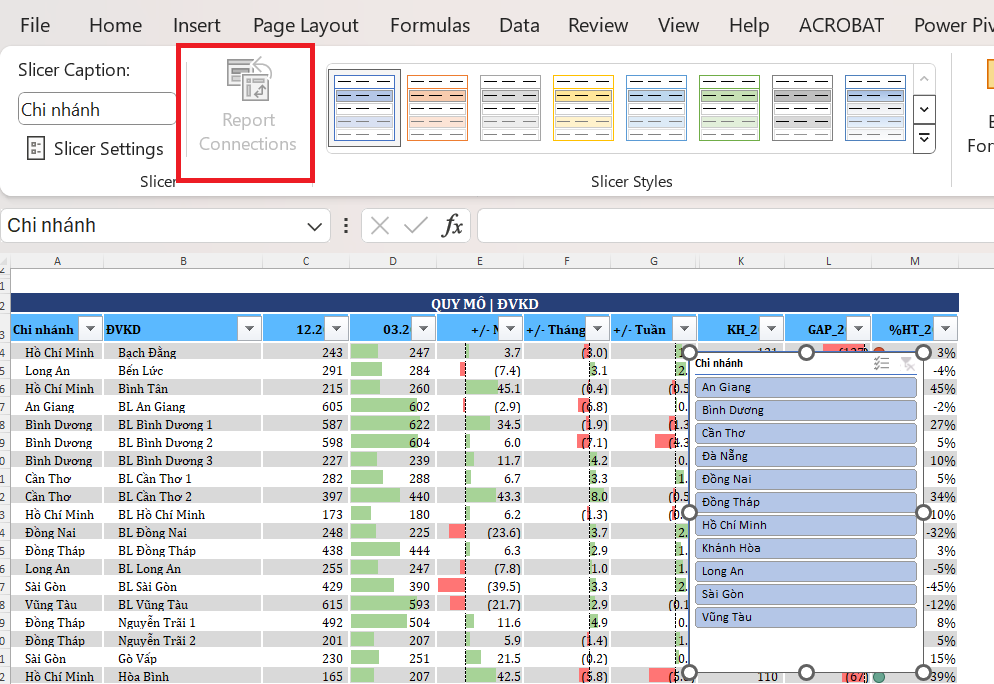 Hiện khi tạo ra table và slicer, thì slicer bị ẩn mục “Report Connections”, không thể kết nối được với các Table khác.