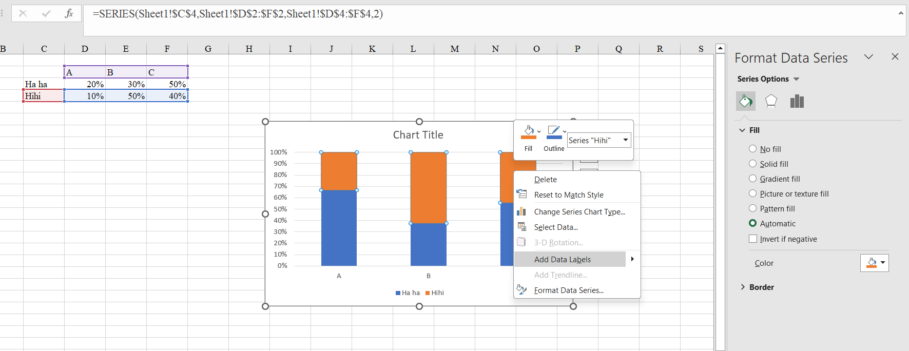 Nếu có thì khi ấn vào Add data label đã xuất hiện % luôn rồi ạ
