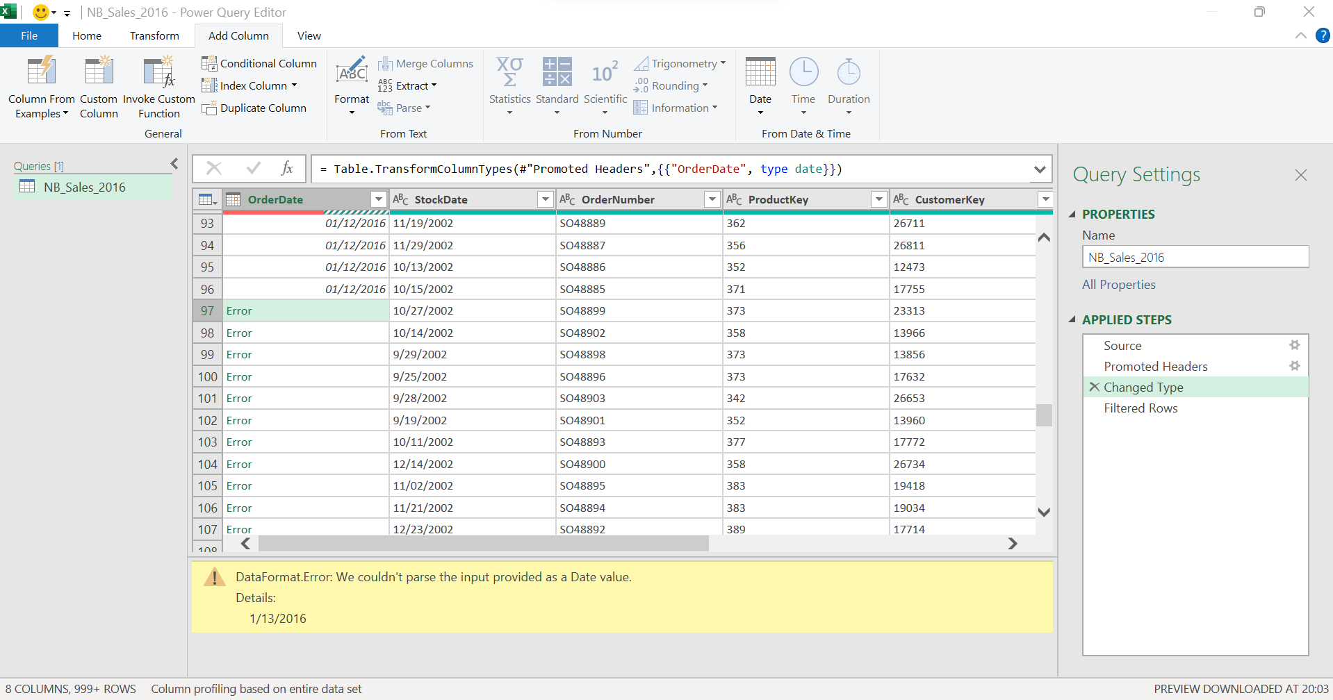 Laptop tôi đang setting region là English (United Kingdom) và đồng thời Power query tôi đang setting là English (United Kingdom). Tuy nhiên, data loading vẫn bị báo lỗi làm không thể chuyển đổi thành định dạng ngày tháng cho toàn bộ cột.
