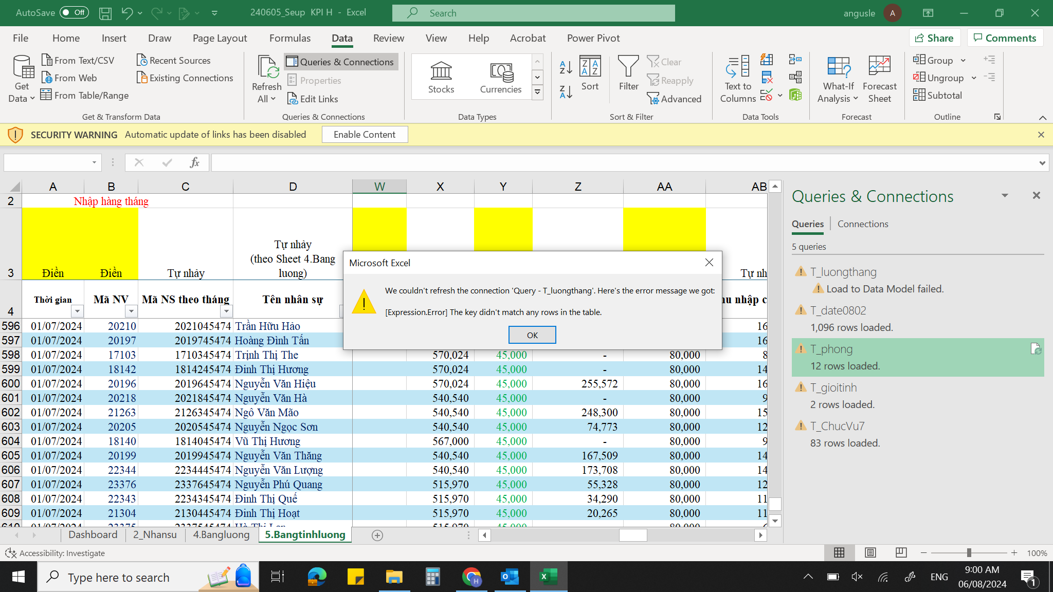 Lỗi của mình ở đây là khi mình nhập thêm dữ liệu dòng theo thời gian các tháng 7 nối tiếp tháng 4, 5,6 mà mình đã setup trước đó. Các tiêu đề cột của tất cả các bảng mình đều ko thay đổi.