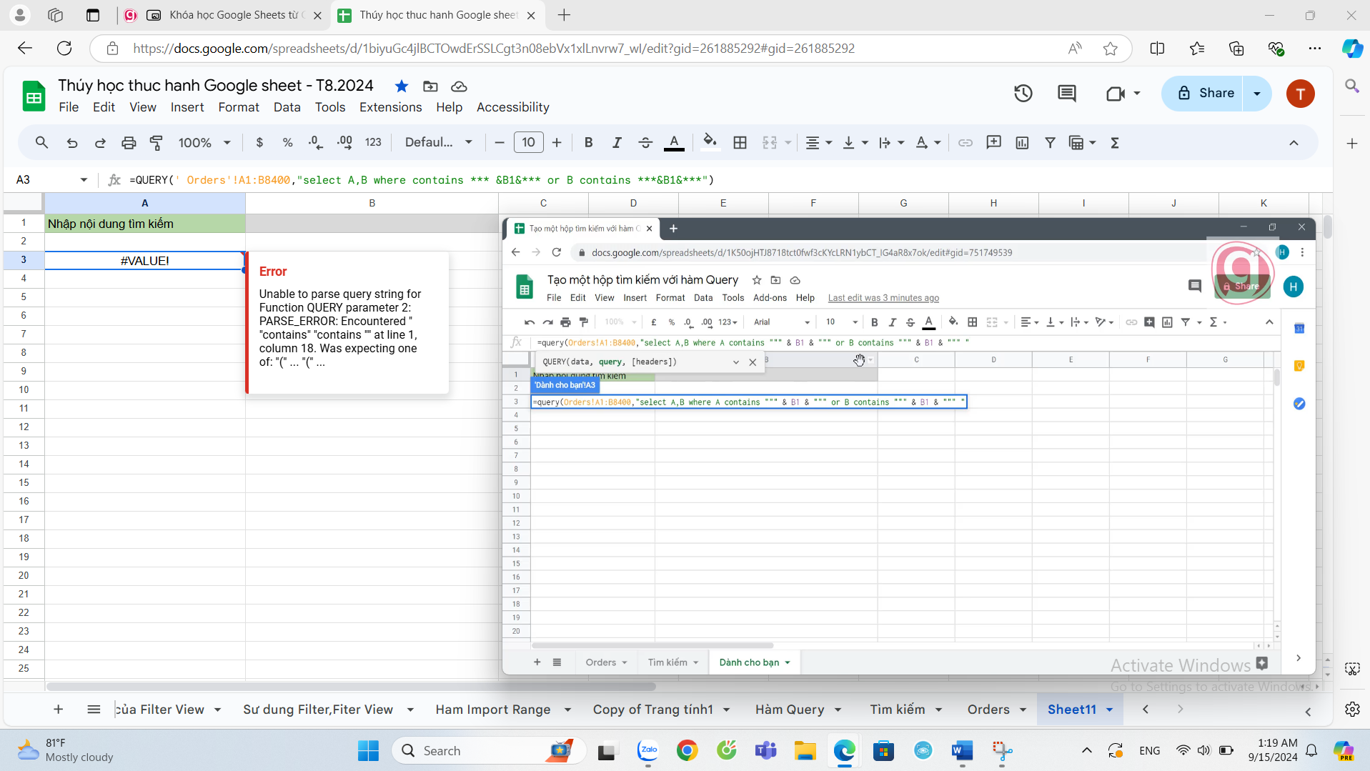 Bạn ơi khi mình làm theo thầy hướng dẫn thì mình bị sai và báo lỗi như dưới, Bạn chỉ giúp mình xem mình đã sai ở phần nào bạn nhé, do mình đặt công thức ko đúng hay ghi thiếu dấu cách?