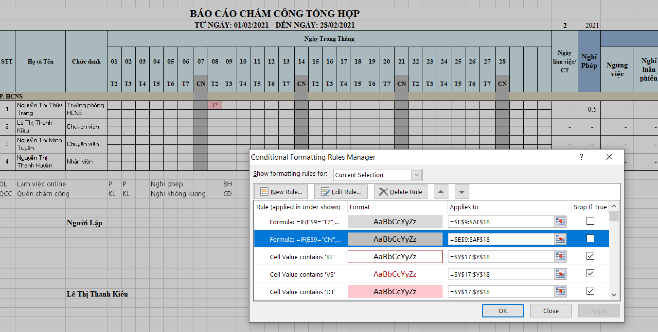 Cho em hỏi, trường hợp công ty nghỉ làm cả ngày thứ 7 và chủ nhật, thì trong bảng chấm công em làm thế nào để có thể tô màu cả ngày T7 và CN ạ