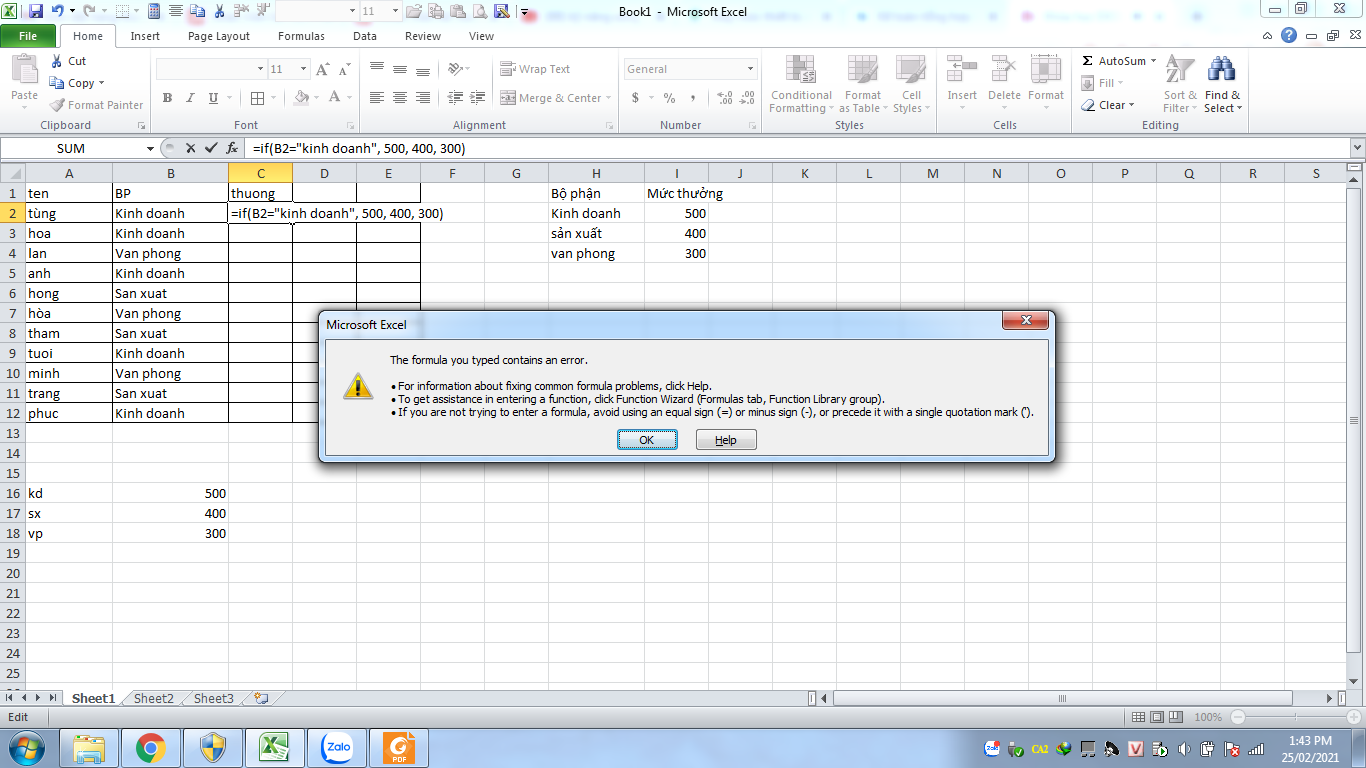 Mình để theo đúng như hướng dẫn =If(B2="Kinh doanh", 500, 400, 300) mà