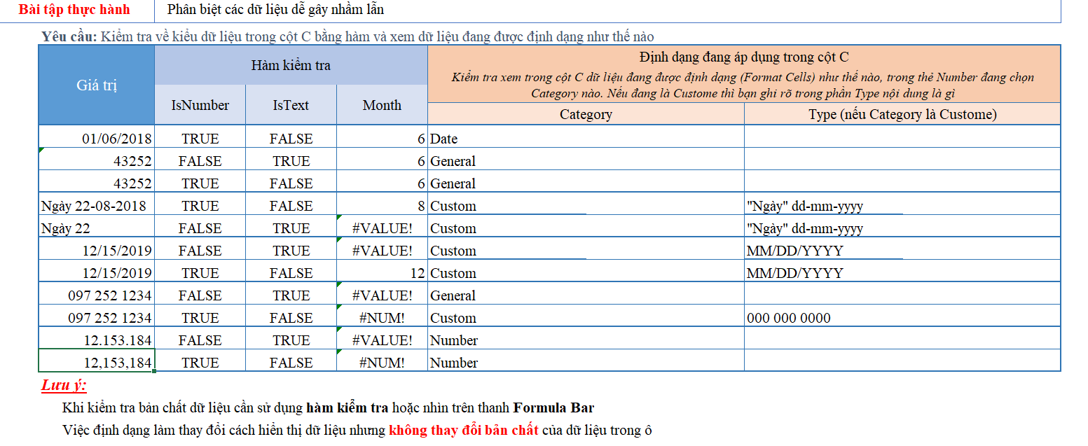 | Khi kiểm tra bản chất dữ liệu cần sử dụng hàm kiểm tra hoặc nhìn trên thanh Formula Bar | |||||||||