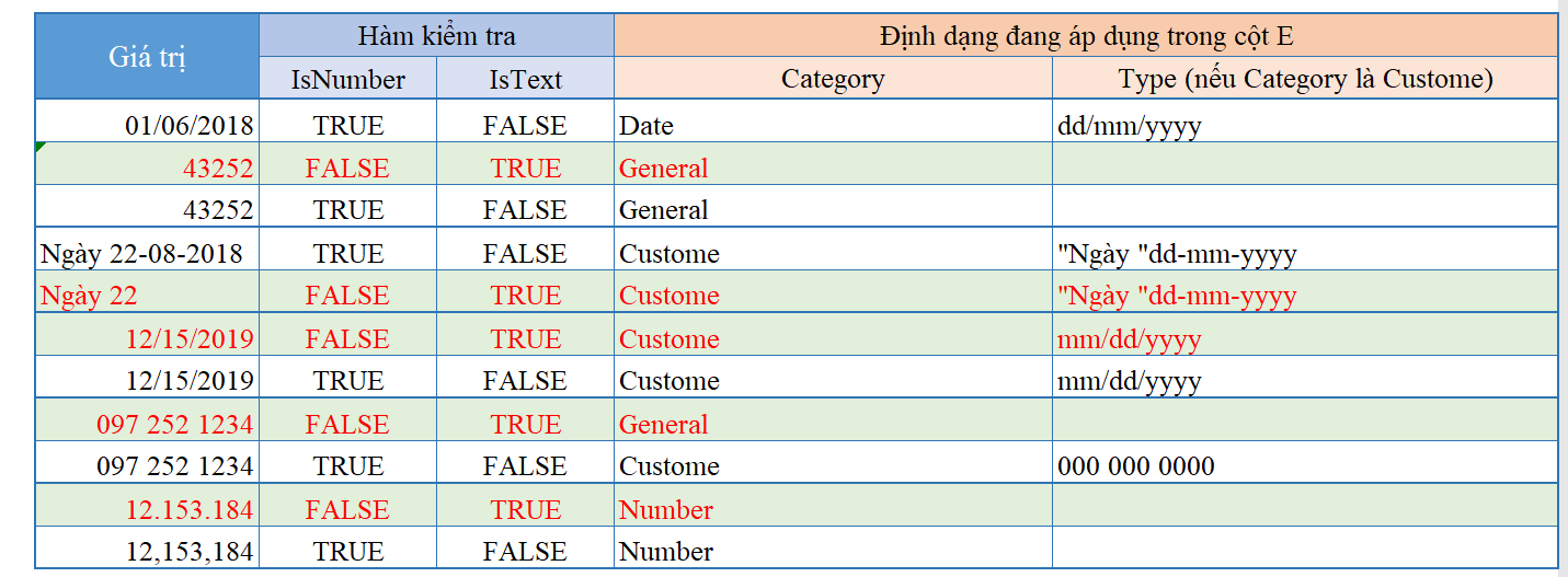 | Giá trị | Hàm kiểm tra | Định dạng đang áp dụng trong cột C | |||||||