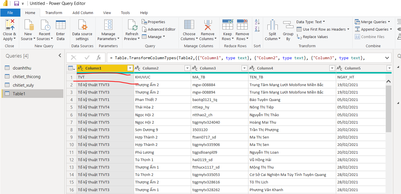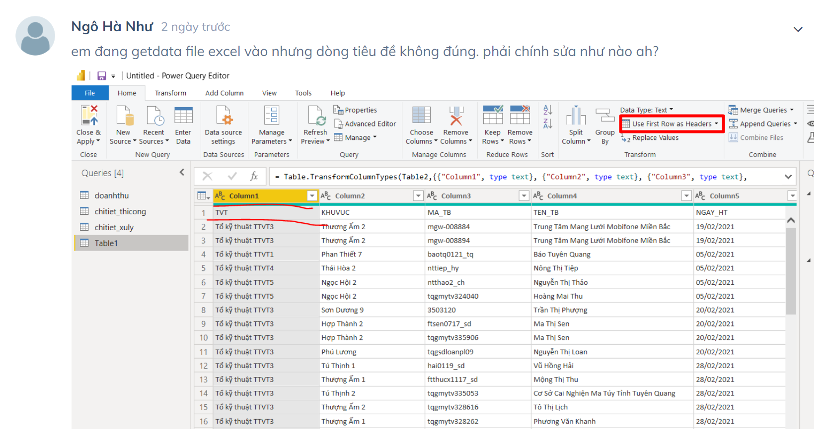 em đang getdata file excel vào nhưng dòng tiêu đề không đúng. phải chính sửa như nào ah?