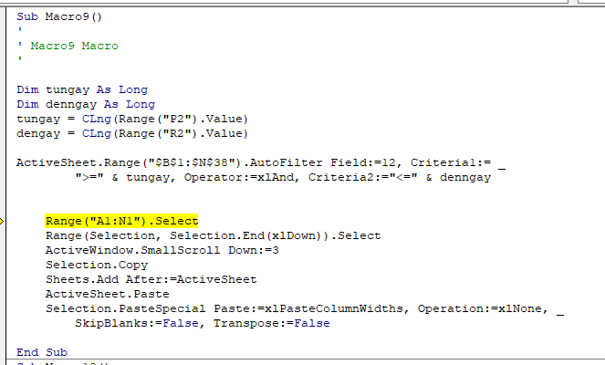 Theo mình hiểu là bạn muốn viết code để trích lọc nội dung từ 1 Sheet A sang 1 Sheet B dựa vào điều kiện ngày (từ ngày và đến ngày). Phương pháp bạn dùng là record macro và sử dụng copy + paste.
