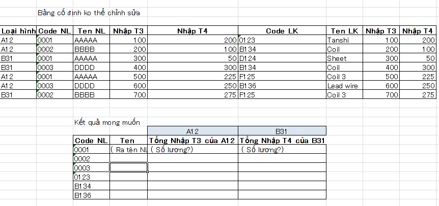 Các này bạn dùng Office 2016+ hoặc 365, có hàm unique, để lấy danh sách Ten NL, sau đó dùng SumIF là được.