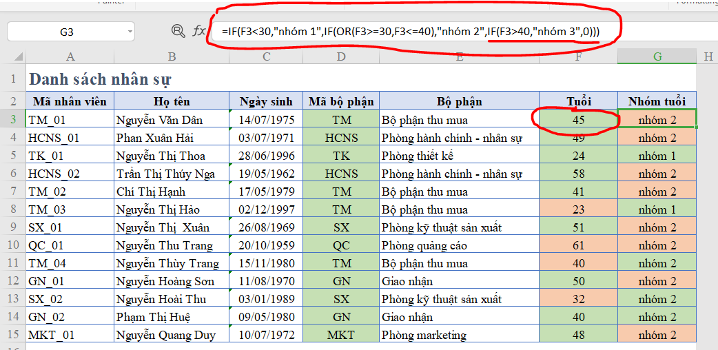 Bạn chú ý là ở hàm IF thứ nhất đã xét F3<30 rồi, thì trong hàm IF thứ hai không cần xét F3>=30 nữa, chỉ cần xét F3<=40 thôi, không cần hàm OR (thực chất nếu dùng thì dùng hàm AND mới đúng)