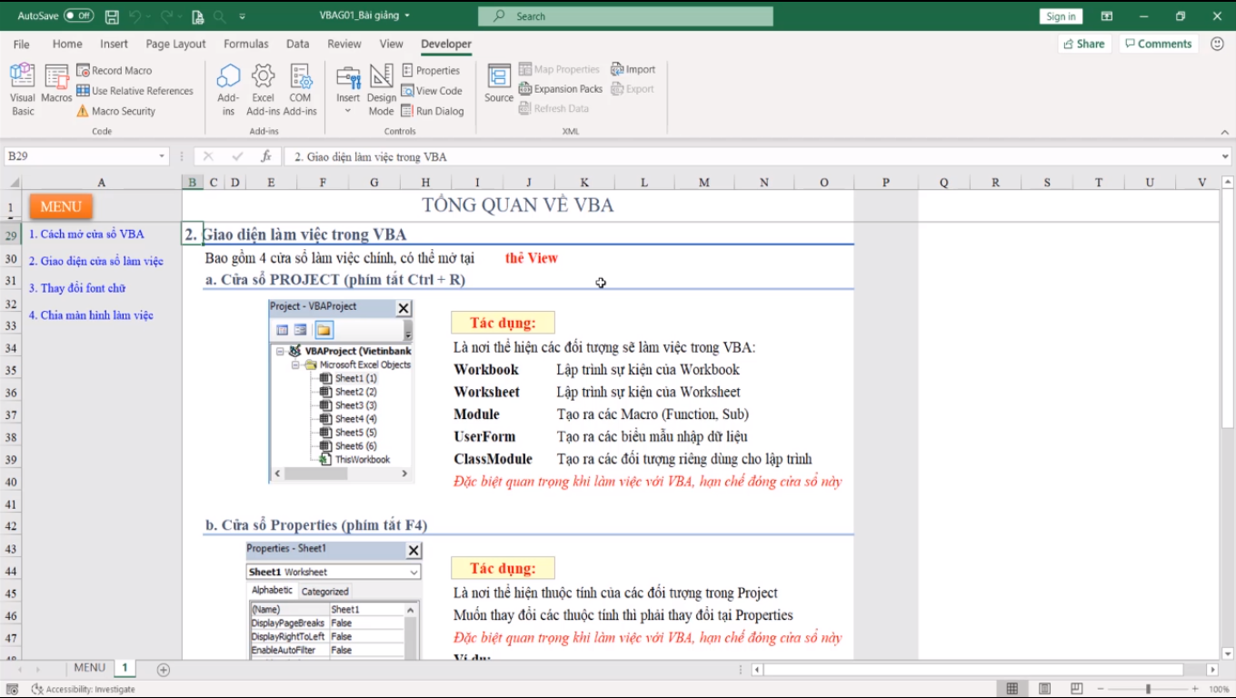Bạn mở 1 file excel bất kỳ lên, mở phần cửa sổ VBA với phím tắt Alt + F11 sẽ thấy giao diện này.