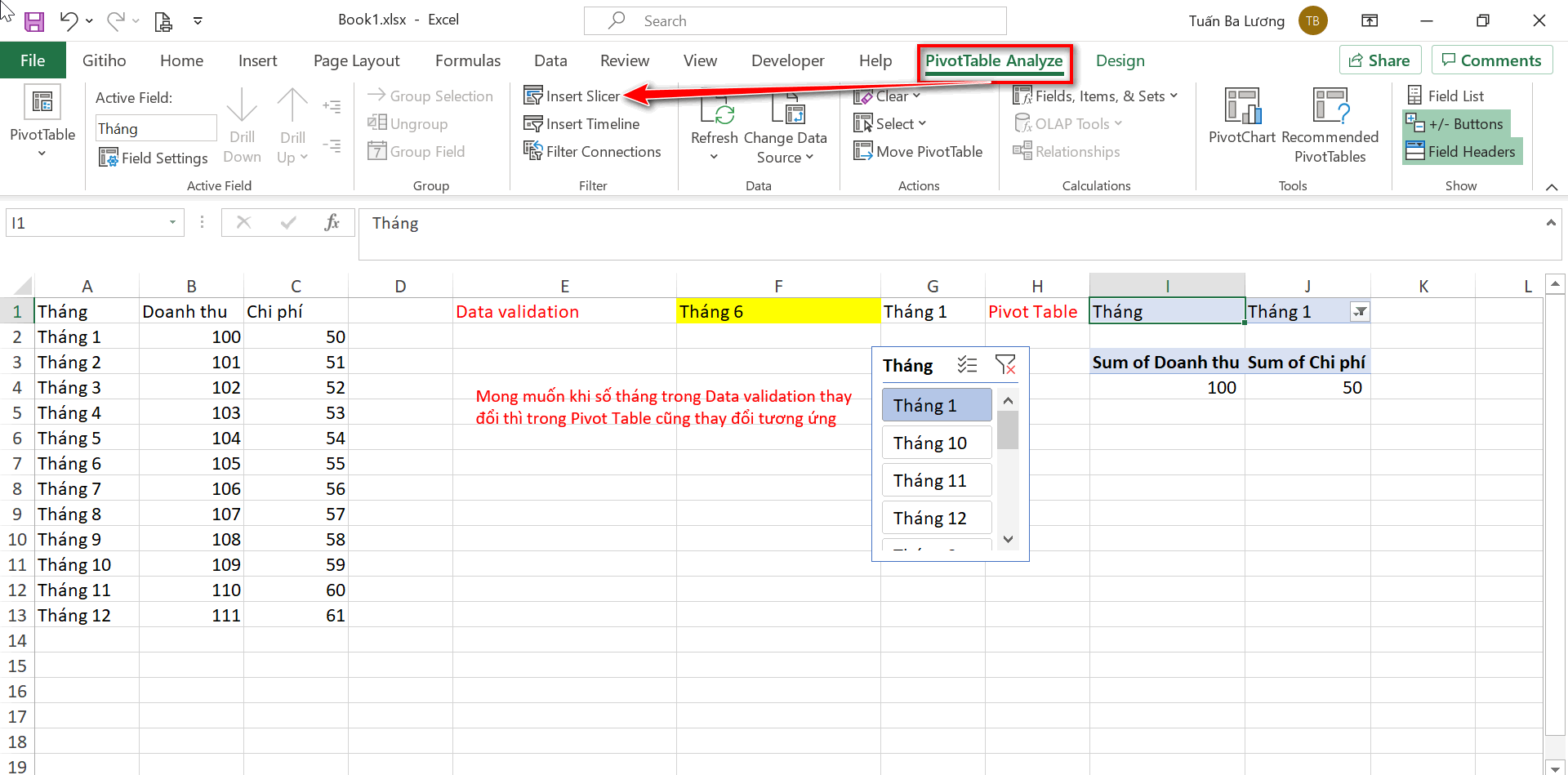 Thưa thầy giáo có cách nào để khi Data validation thay đổi thì điều kiện lọc trong pivot table cũng thay đổi tương ứng ( tức là có sự liên kết giữa Data validation và pivot table).