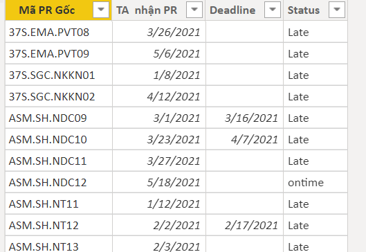 Mình không thấy phần upload file nên mình gửi hình ảnh nhé. Đây là file mình đang query trên powerbi của mình, hiện có cột "TA nhận PR".