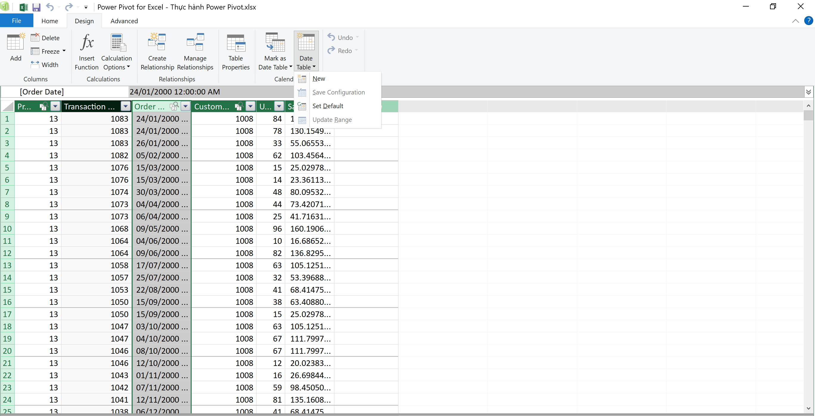 3. Nếu bạn muốn lấy cột ngày ra thành 1 bảng Calendar, thì trong phần tab Design, ta có tính năng tạo Date Table luôn, còn với các trường khác thì trực tiếp trong Power Pivot ta không làm được, bạn có thể sử dụng kỹ thuật Excel ở file gốc, tạo thêm 1 sheet, rồi dùng Hàm Unique để lấy giá trị, thì khi nạp vào Power Pivot, ta sẽ có 1 bản như bạn muốn nha