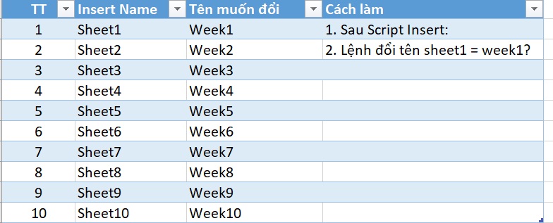 Cho em hỏi có cách nào đổi tên 10 sheet sau khi mỗi lần insert new sheet, các sheet này có 1 danh sách tên ví dụ: Week1 - tới Week10?