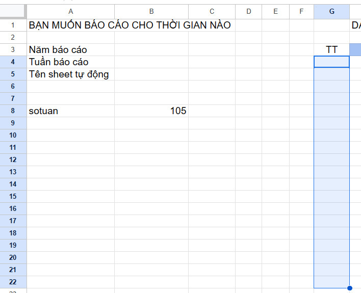 Em có số lượng tuần là 105, muốn tự gán cho cột số thứ tự tăng dần từ 1 => 105 như hình. Em dùng for mà gán ko chạy.