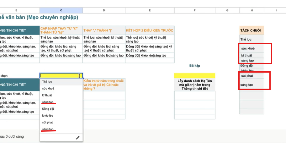 Thầy vui lòng cho em hỏi là khi tách chuỗi (Cột H), thì kết quả của một số từ khi tách có chứa dấu cách ở đầu (Ví dụ: sức khỏe; kĩ thuật, sáng tạo)… Dẫn tới mặc dù đã dùng hàm unique nhưng trong ô tách chuỗi kết quả vẫn cho ra hai giá trị “sáng tạo” (một có cách ở đầu,một thì k)