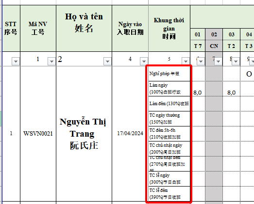 Bảng chấm công của e 1 người có nhiều tiêu chí thì áp dụng ntn ạ