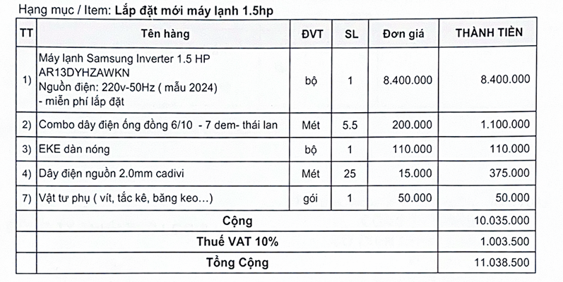 Dạ, loại hình kinh doanh của công ty em là thương mại, dịch vụ điện lạnh (CT TNHH MTV, do giám đốc là người đi lắp, ko có nhân viên). Ống đồng mua vào là cuộn 15m, nếu bán ra theo hợp đồng dịch vụ như này thì ống đồng đưa vào 152 hay 156 ạ?