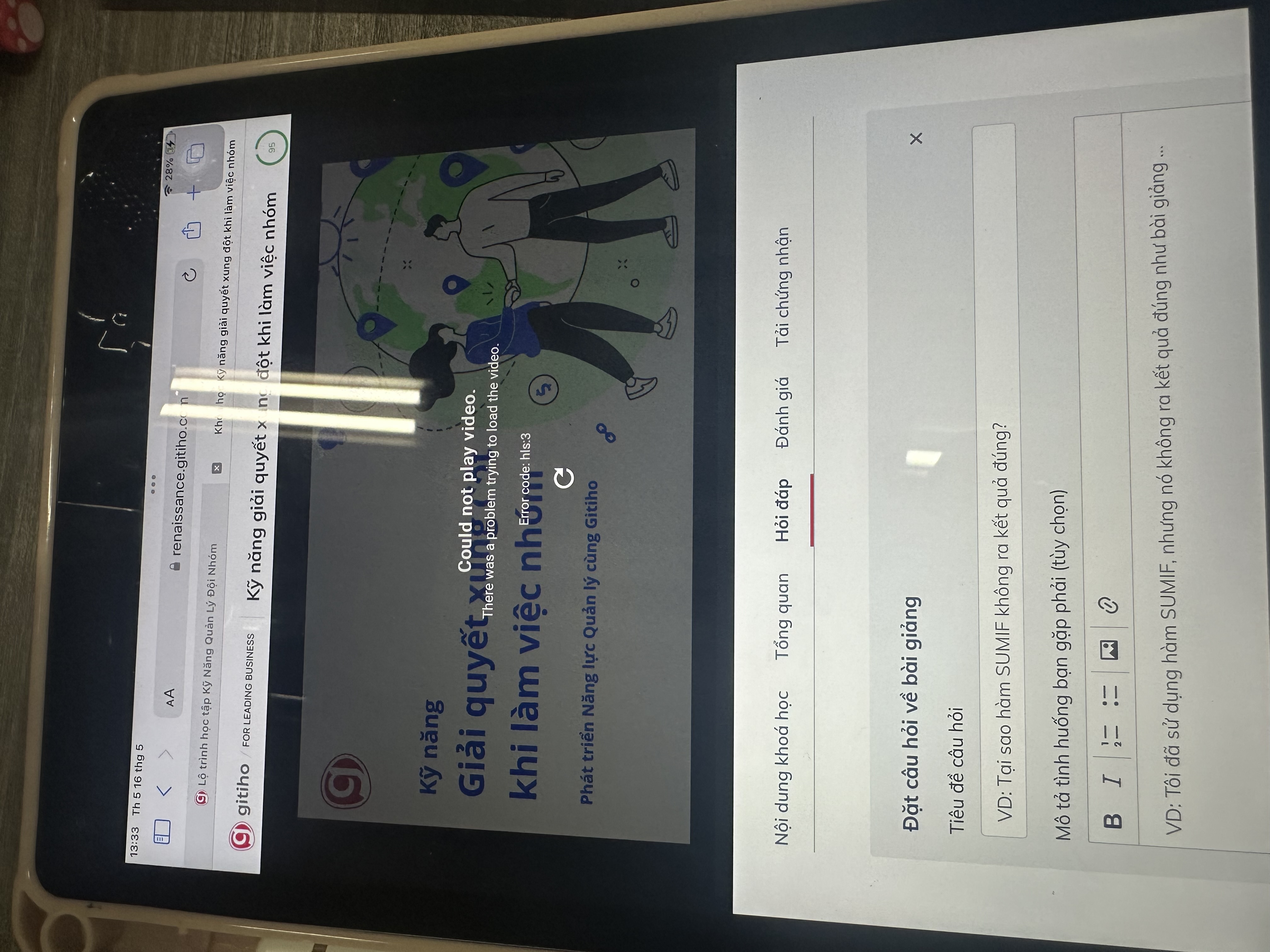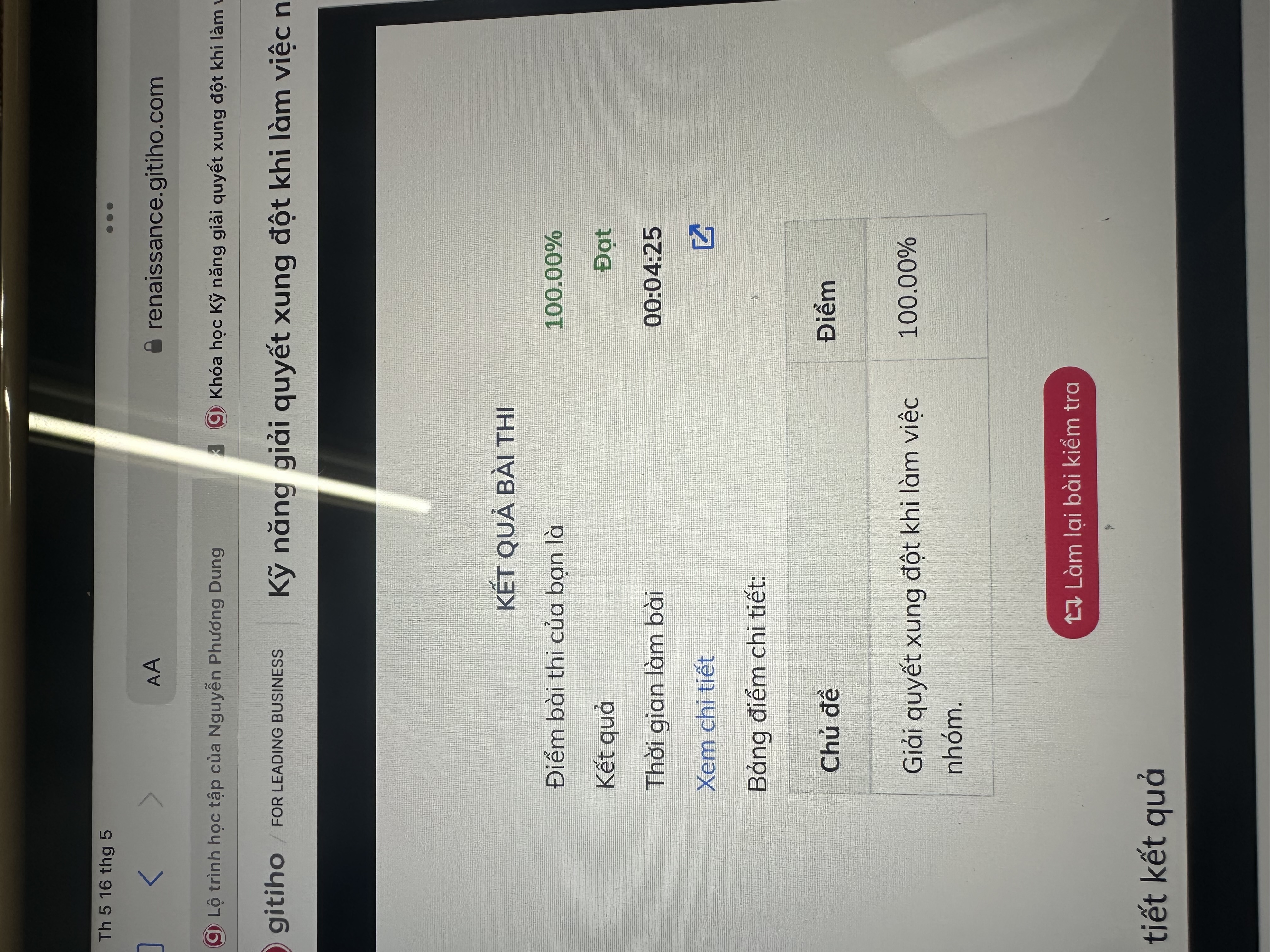 Dạ vâng điều này có thể do lỗi hệ thống. Anh/Chị yên tâm học tiếp các nội dung sau ạ. Nếu sau này Anh/Chị không tải được chứng nhận có thể gửi câu hỏi lên để Gitiho hỗ trợ kiểm tra cho Anh/Chị và cung cấp chứng nhận khóa học cho Anh/Chị nhé ạ
