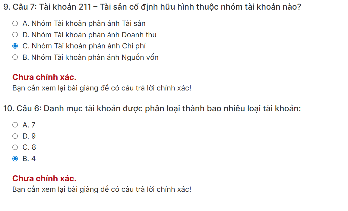 Câu 6: Danh mục tài khoản phân thành 9 loại nha.